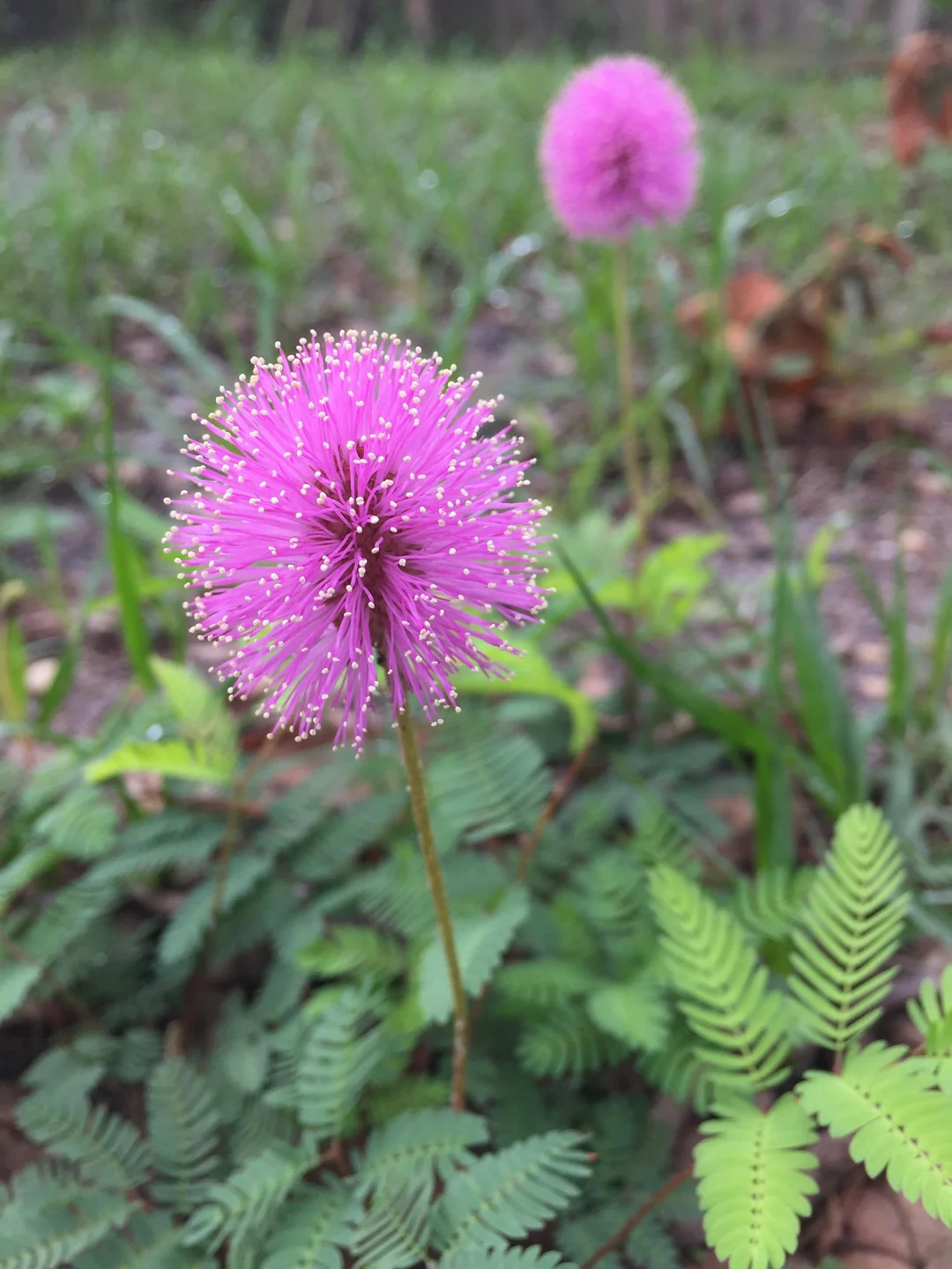Powderpuff mimosa is an effective ground cover because it spreads very quickly. As few as four or five pots can cover up to 300 square feet in a season. However, it’s not an overly aggressive plant and can be intermixed with turfgrass or other plants.